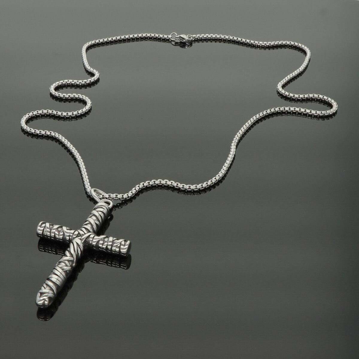 Stylowy wisiorek w formie krzyża osadzony jest na solidnym łańcuszku o długości 60 cm, co sprawia, że idealnie dopasowuje się do każdej sylwetki. Geometryczne zdobienia dodają mu unikalnego charakteru, dzięki czemu wyróżnia się na tle innych modeli biżuterii męskiej.